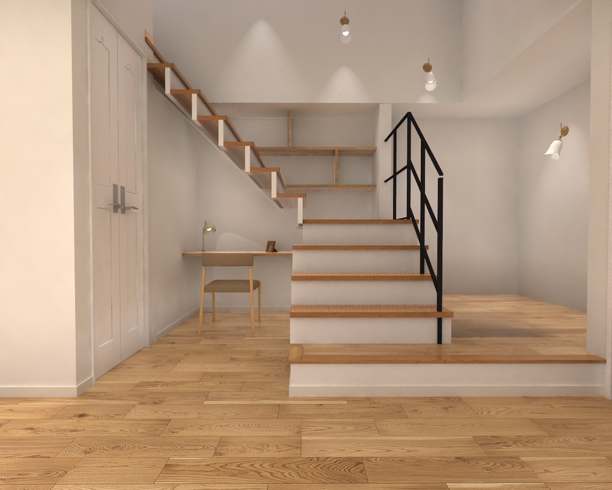 - 階段周辺に本棚・小上がりを設け、念願のライブラリースペースに