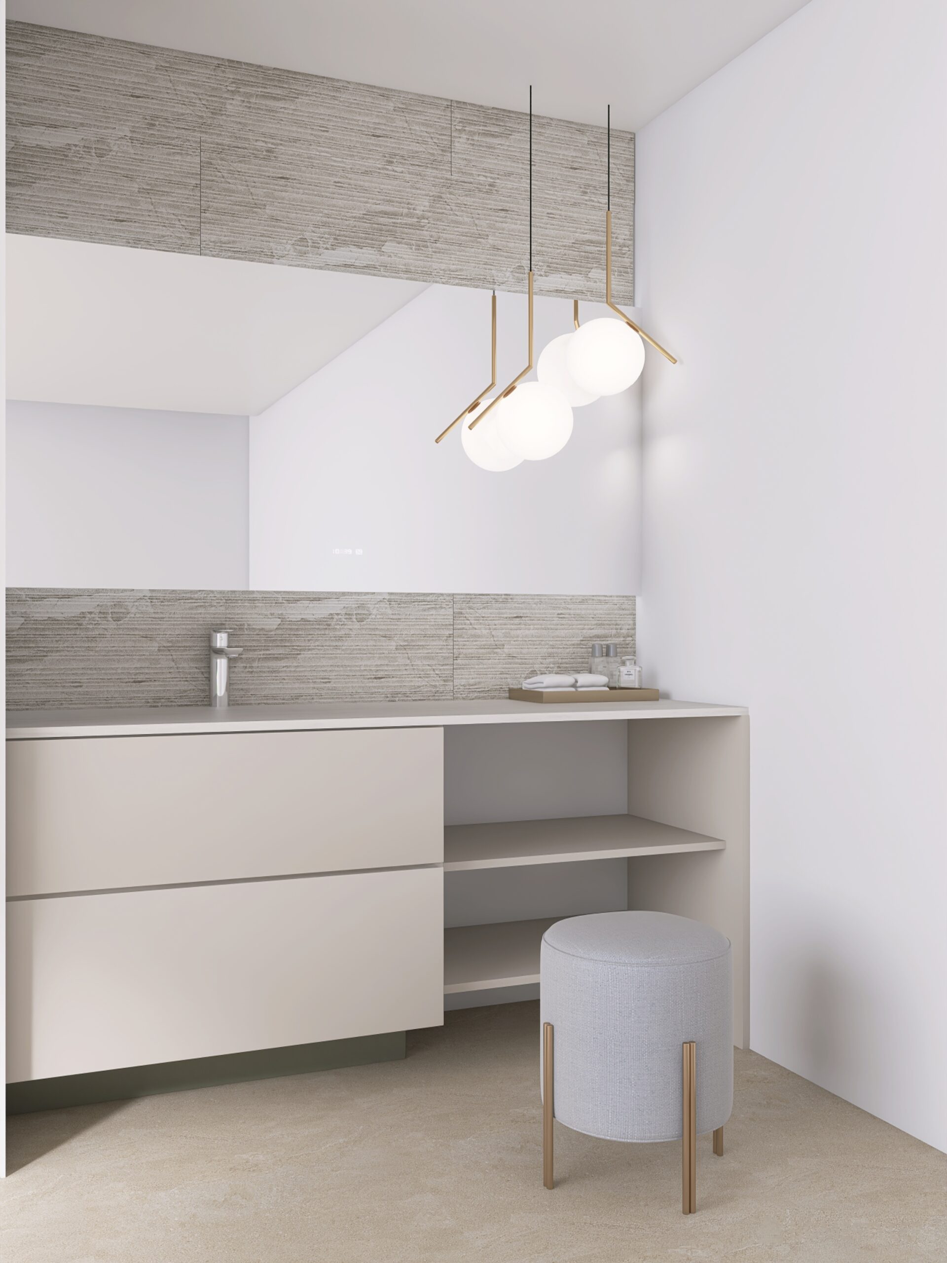 モノトーンで端正にまとめた外観に、 室内は柔らかなニュートラルトーンで統一した、大人のためのミニマル空間。 お気に入りの照明とミラーを備えたメイクスペースが、 一日の始まりと終わりを自分らしく演出します。