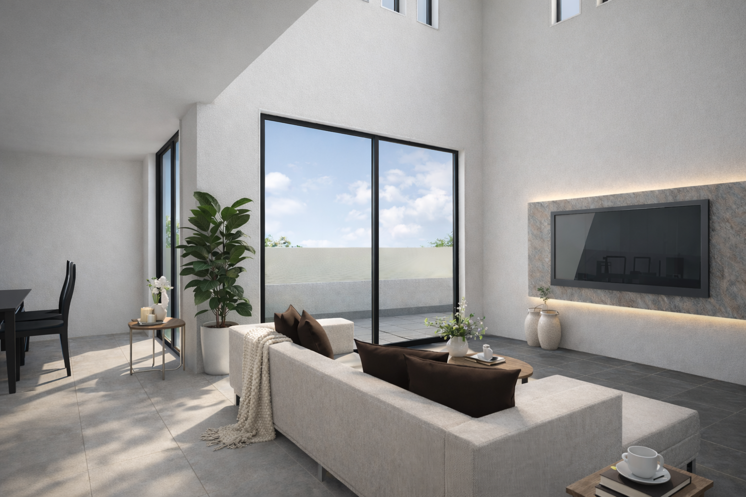 高窓から取り込んだ光が、吹き抜けを通ってリビング全体へやわらかく広がる空間。 窓の配置や間取りを綿密に計算することで、時間帯によって表情を変える明るさと開放感を生み出しました。 家族が自然と集まり、深呼吸したくなるようなリビングです。