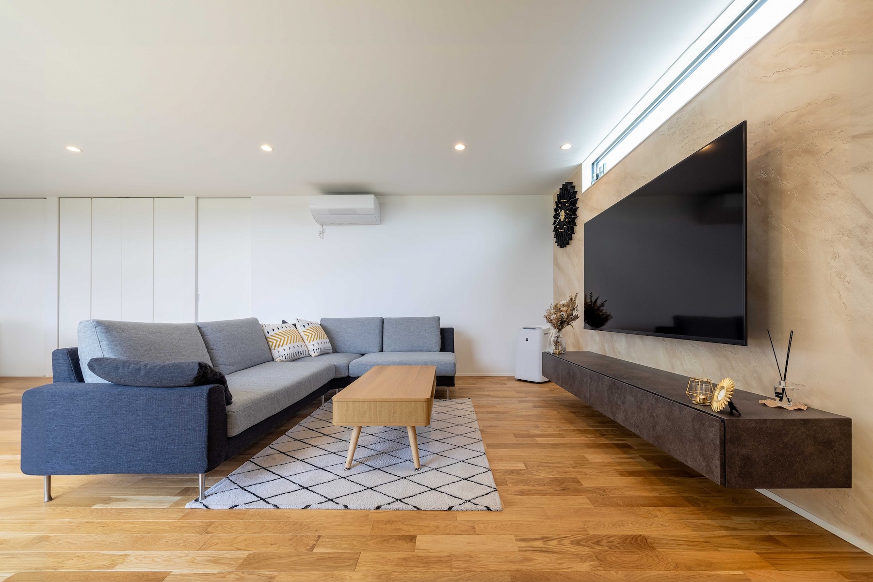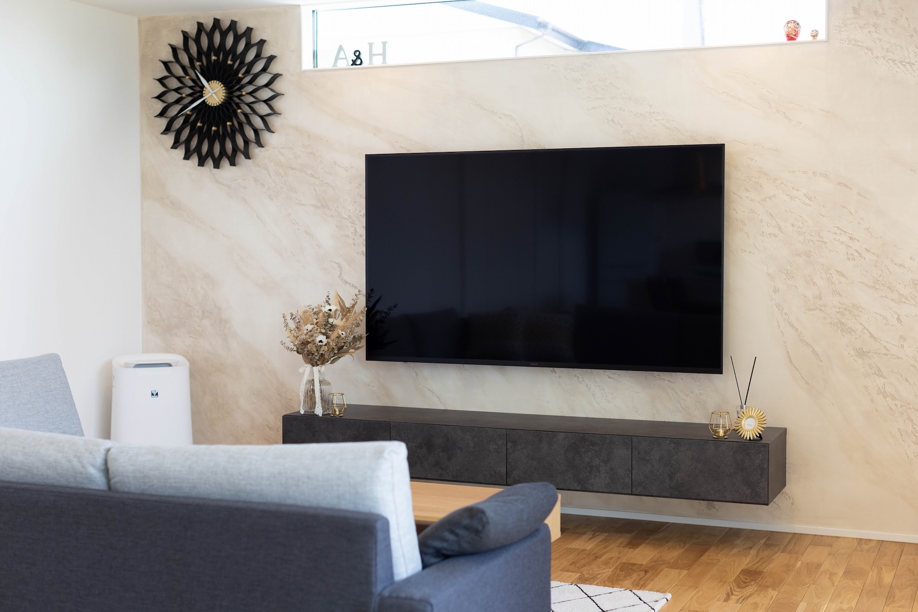 TV背面の壁には表情豊かなイタリア漆喰「ユーロスタッコ」を採用。