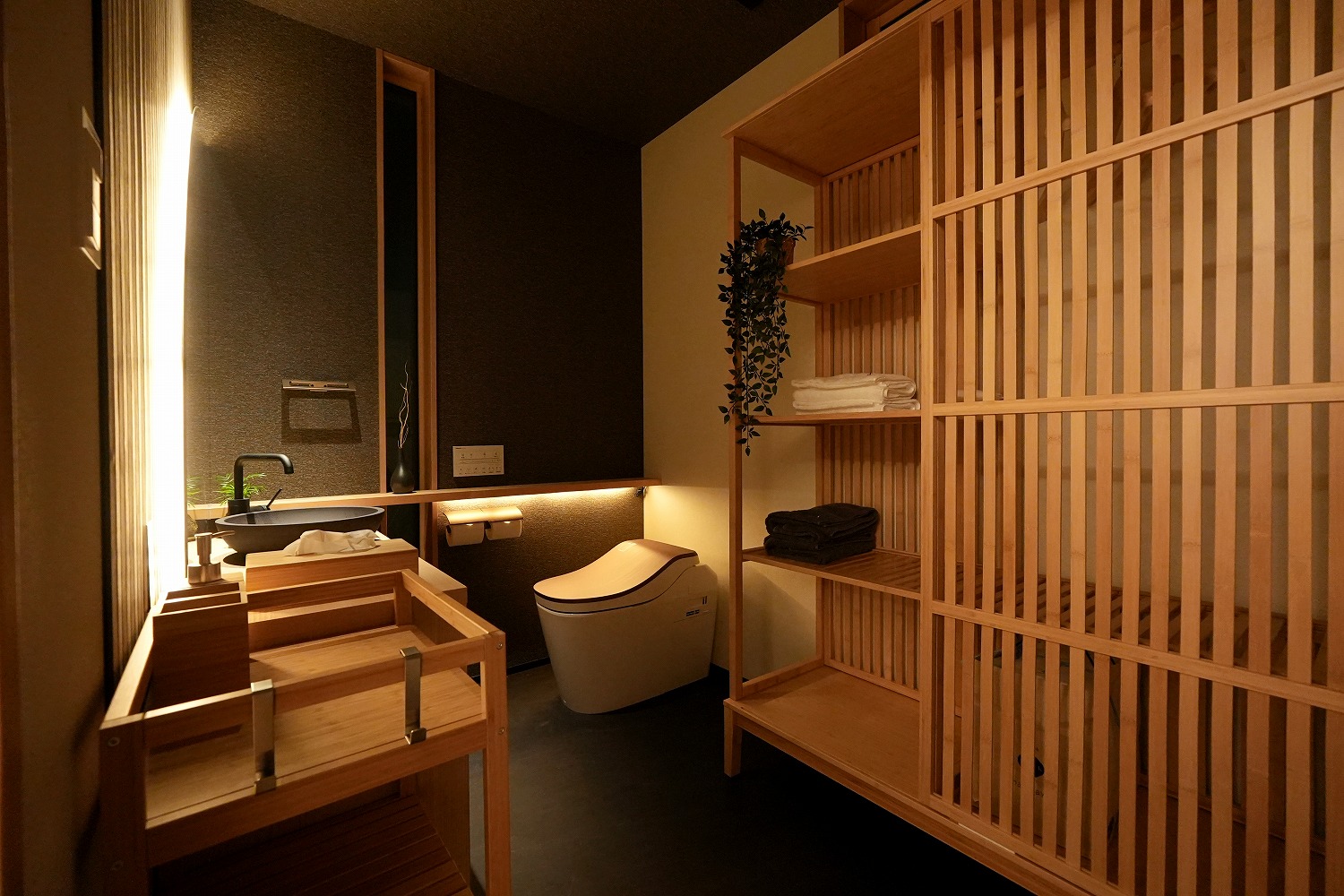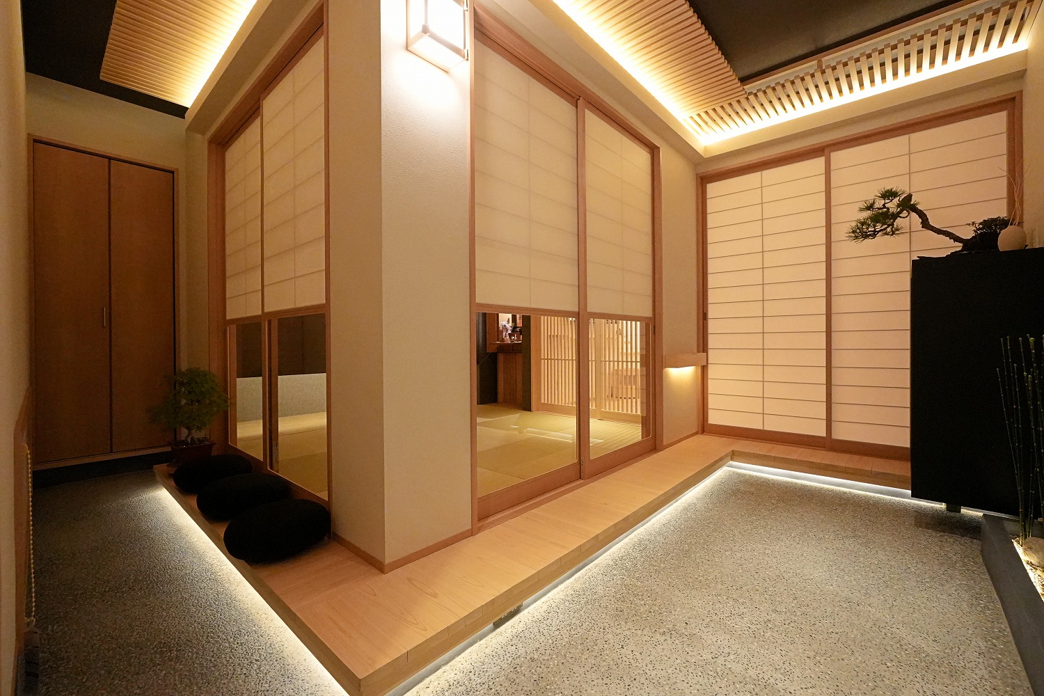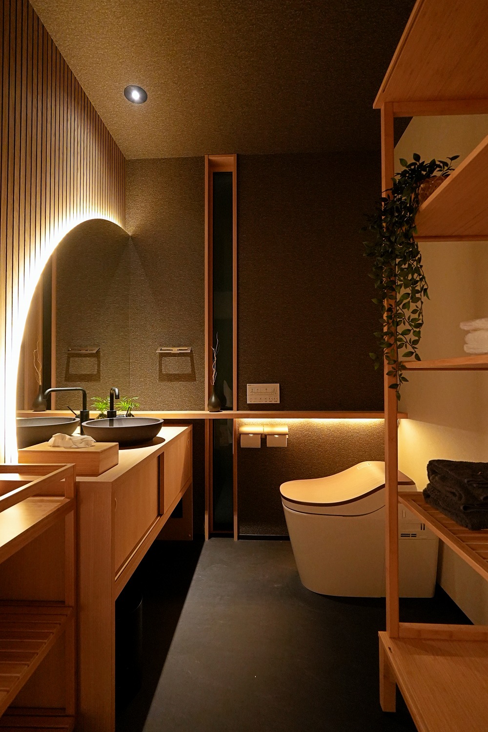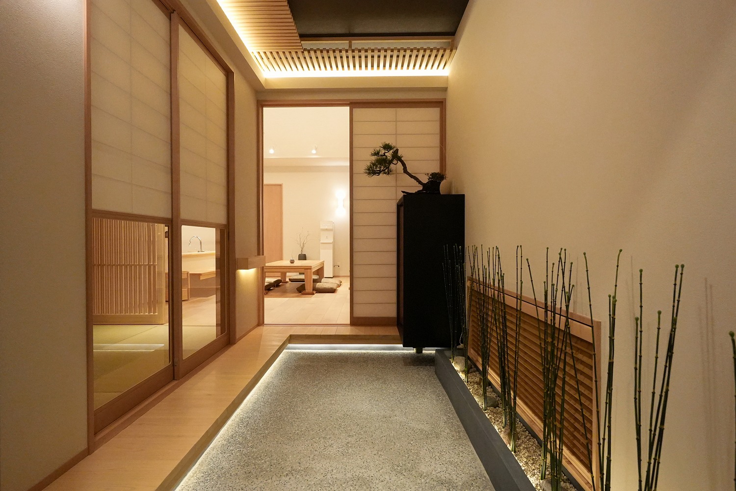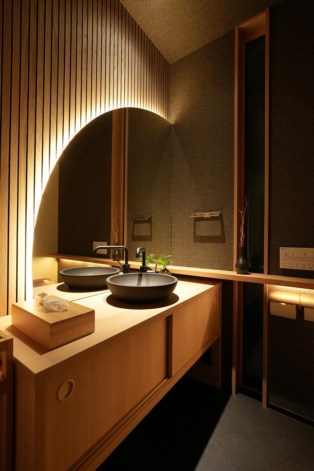 デザイン性あふれる建具に囲まれた和室や洗面室などが、