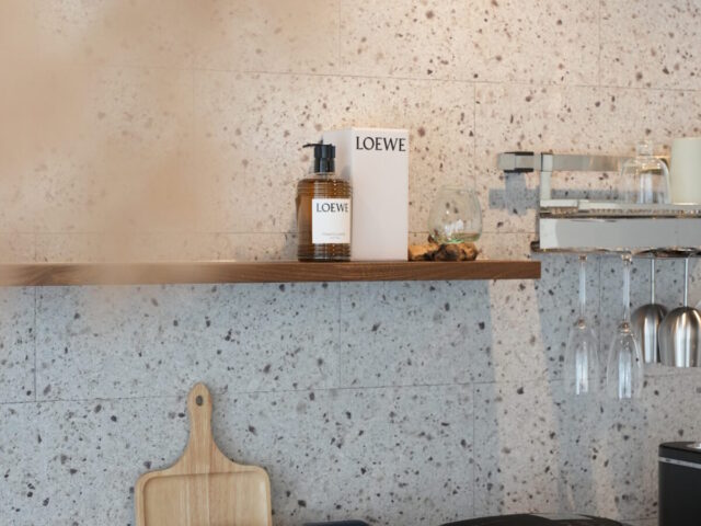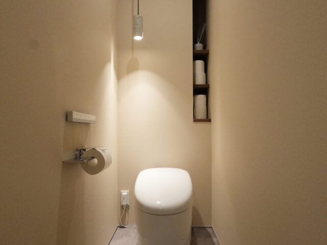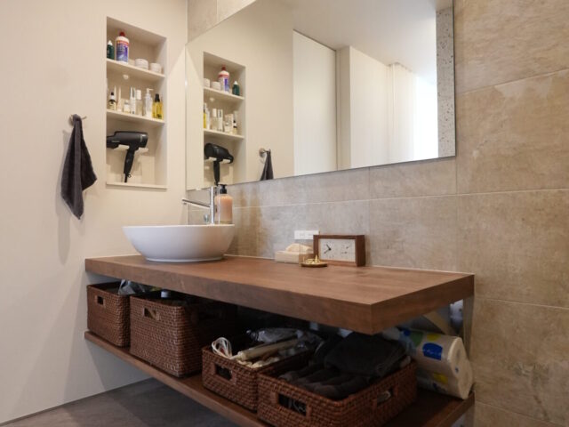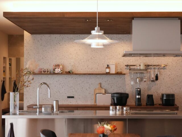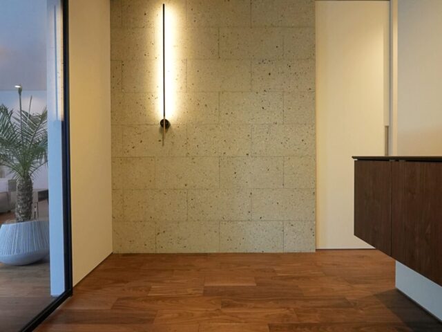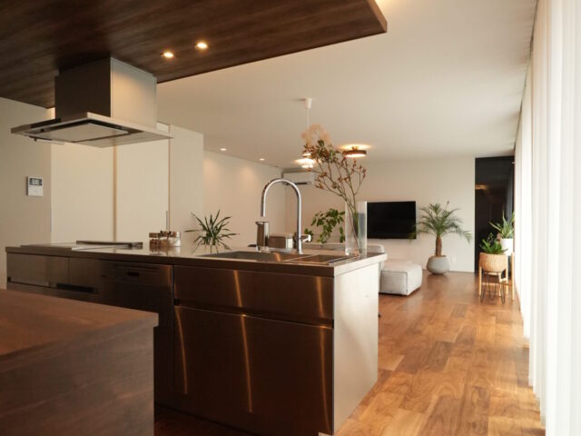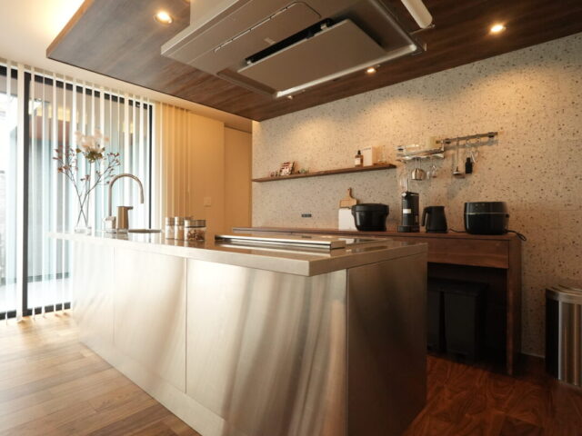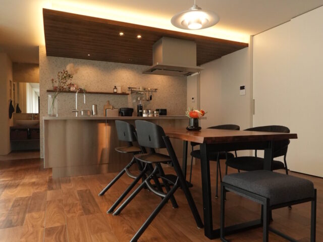 ウォルナット、ステンレス、大谷石など異素材を調和させた上質な空間。