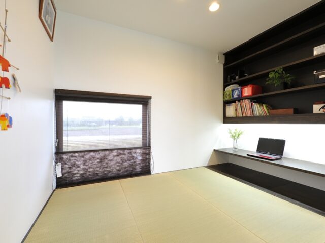 リビングに面した小上がりのタタミコーナー。床を掘り下げて足を入れられる書斎としても活用。