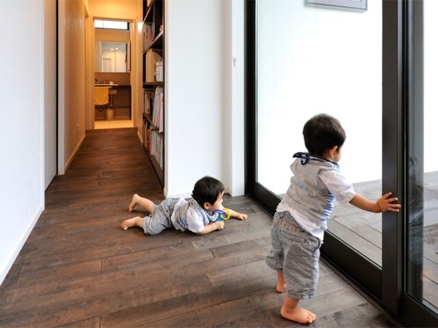 廊下も小さな子供には遊び場となります。本棚も作り付けて読書スペースとしても。
