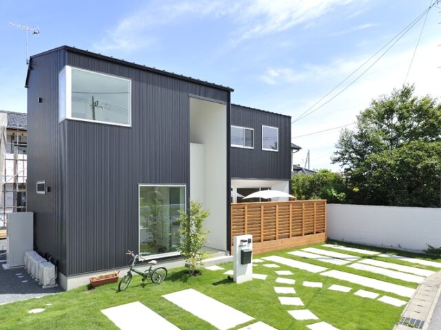 黒いガルバリウムと白の外壁がかっこいい外観を作り出しています。