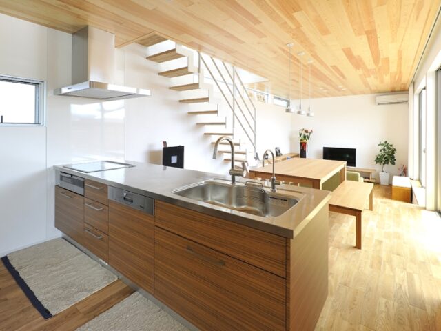 ミーレの食器洗い機をビルトインしたオリジナルキッチン。キッチンからリビングまで見渡せるので子育て中も安心です。