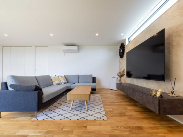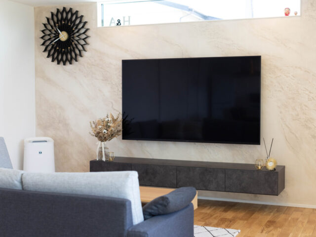 TV背面の壁には表情豊かなイタリア漆喰「ユーロスタッコ」を採用。
