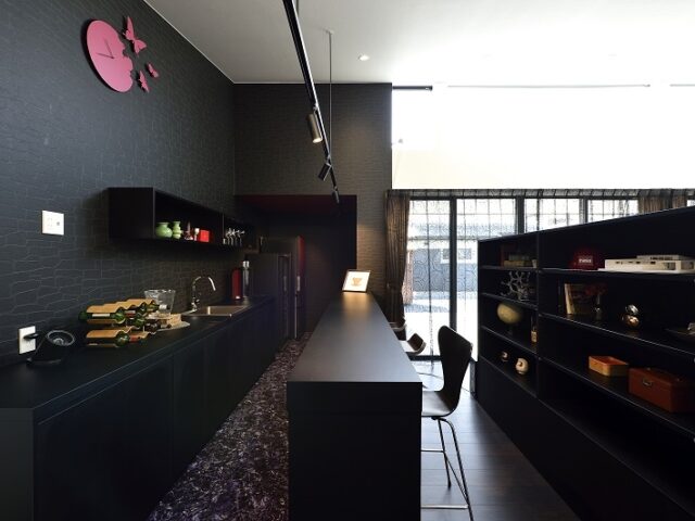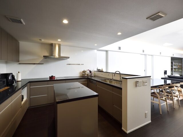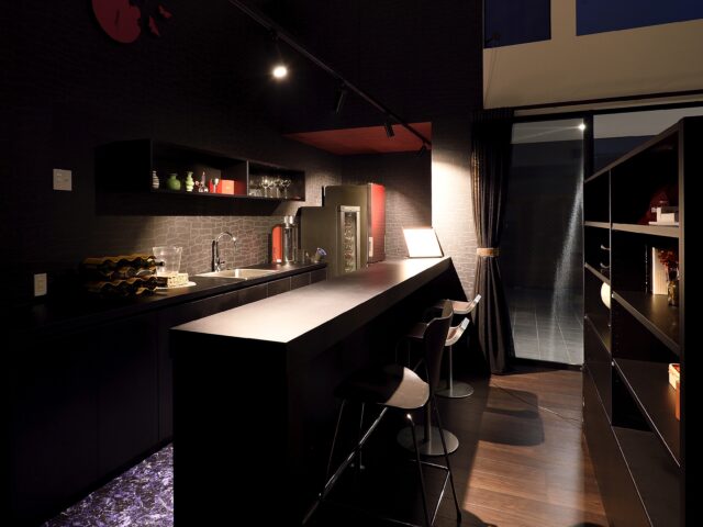ワイン好きのご主人のバーカウンターに、広々と使いやすいコの字型のオーダーキッチン、愛犬専用コーナー
