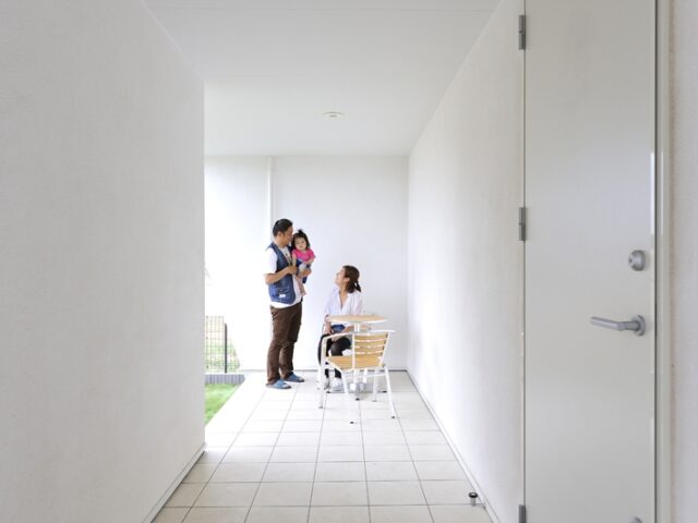 玄関前のアプローチはちょっとした憩いの場。テーブルを置いてティータイムも楽しめます。