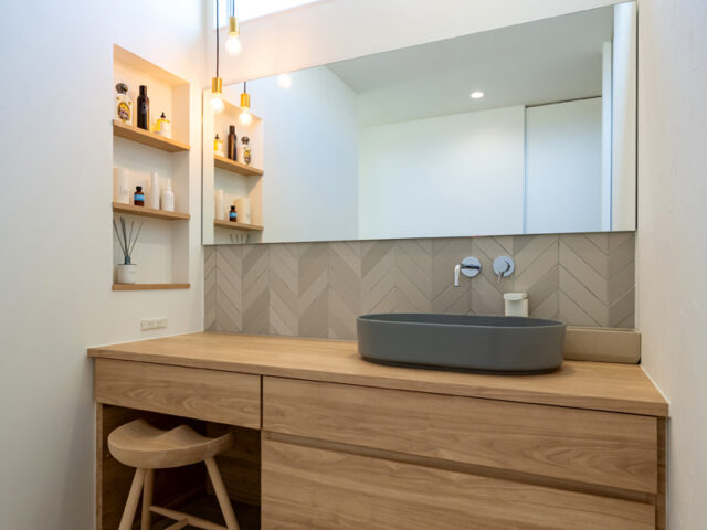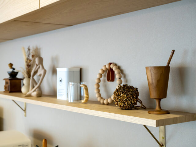 無機質なグレーと温かみのある木目の組み合わせが、センスを感じさせます。
