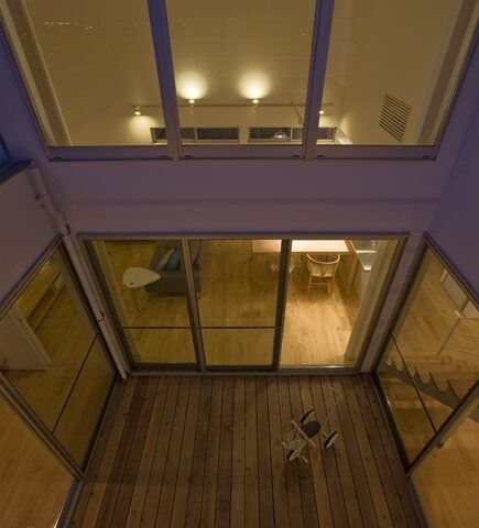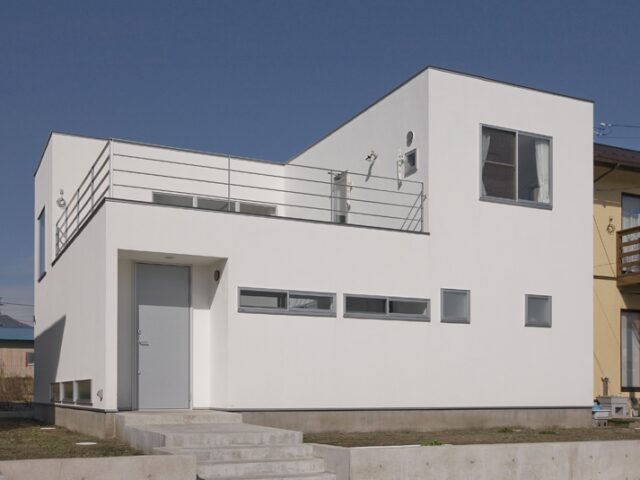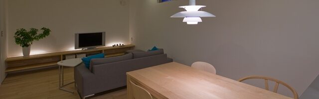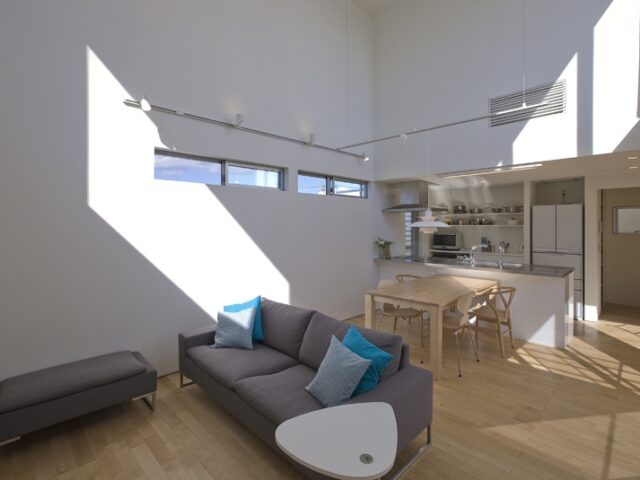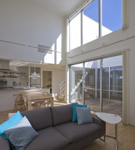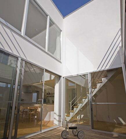 中庭を設けること、南側には2階を乗せないことで、内部空間へ光と風を取り込む。