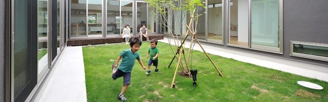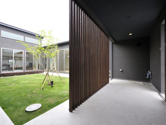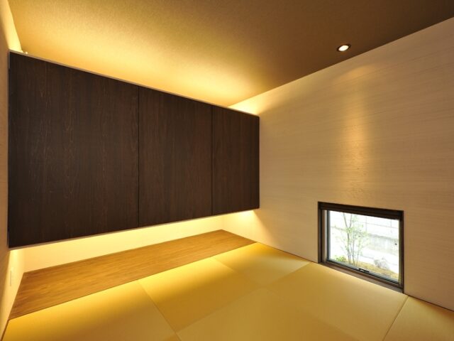 中庭の景色、間接照明がつくる光の表情、長い廊下はこれらを楽しむための装置。