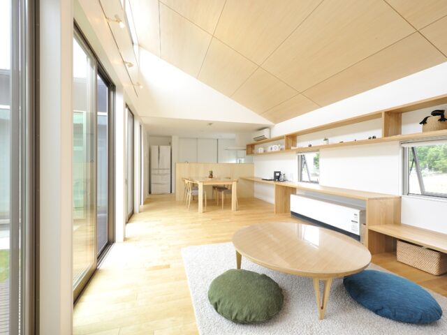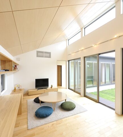 リビングは勾配天井に木の素材感をプラスした特別な場所・・・