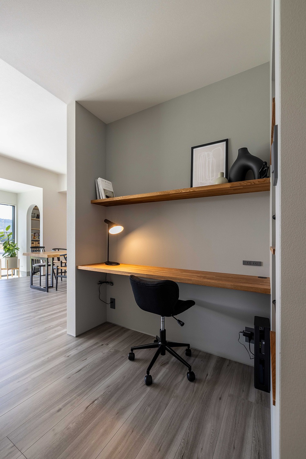 圧倒的な存在感を放ちながらも、空間に無垢材が持つ優しさを与えています。