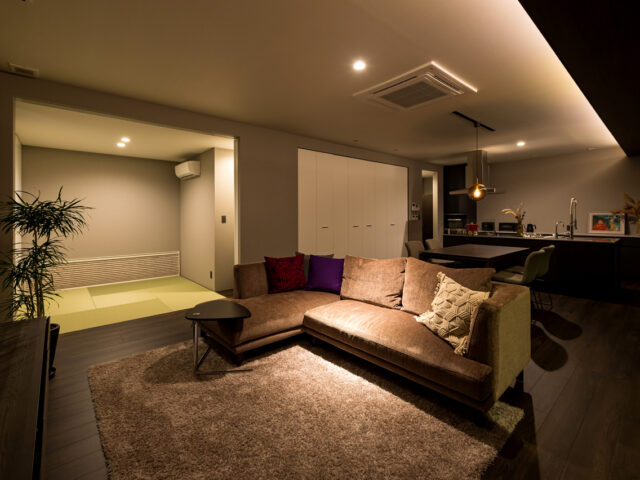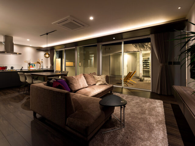 貼り方向をリビングと揃え、室内の延長のように演出。