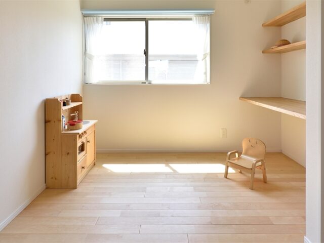 リビングから近くにつくったシンプルな子供部屋。作り付け収納とデスクで広々使えます。