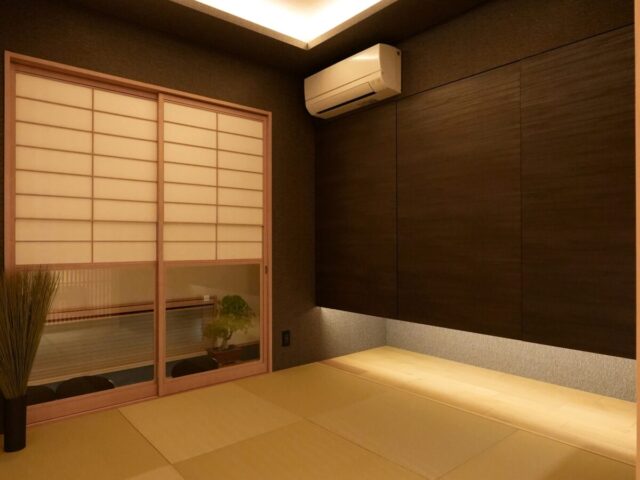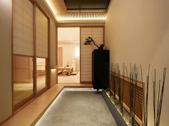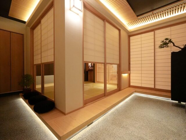 デザイン性あふれる建具に囲まれた和室や洗面室などが、