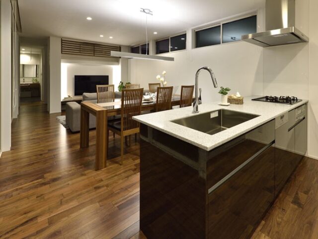 無垢材の床にクチーナのキッチンが映え、存在感を際立たせています。