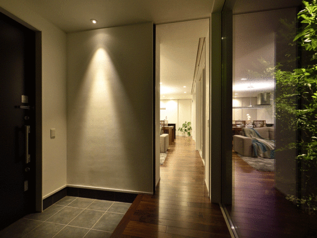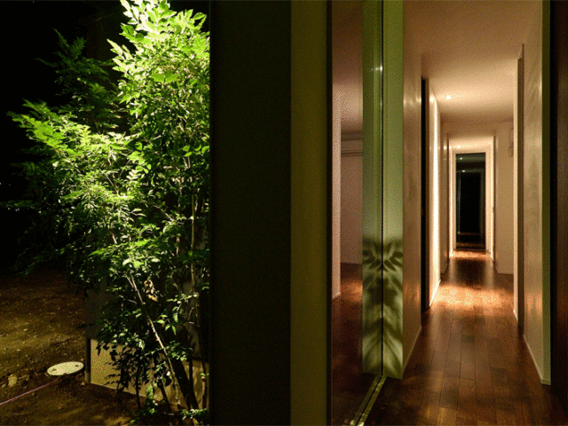 坪庭の植栽にあてたライトや廊下の照明はメリハリをきかせて表情を楽しんでいます。
