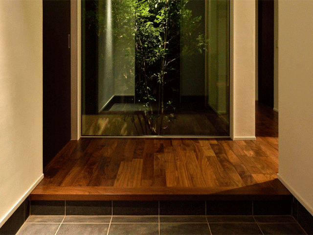 玄関に足を踏み入れると目に入る正面の坪庭。植栽と共に季節や時間の移り変わりが感じられます。