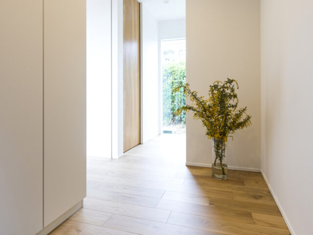 LDKから寝室、洗面脱衣室、ランドリールームへ繋がる廊下のない間取り。