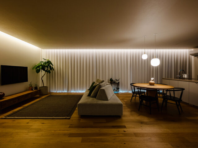 昼間の開放感とは対照的に、夜は間接照明とペンダント照明の灯りで落ち着いた雰囲気に包まれます。