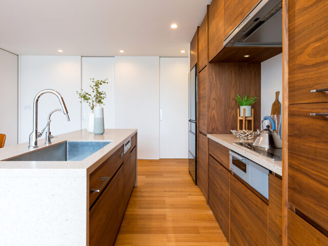 壁面収納とレンジフードを隠す工夫が生活感を感じさせない