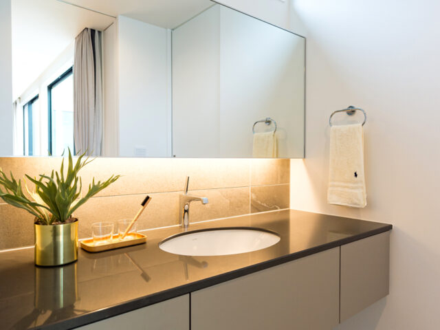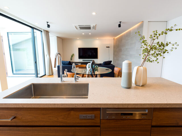 キッチンの天板は優しいベージュを組み合わせ、主張する木目の印象を和らげる