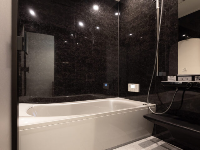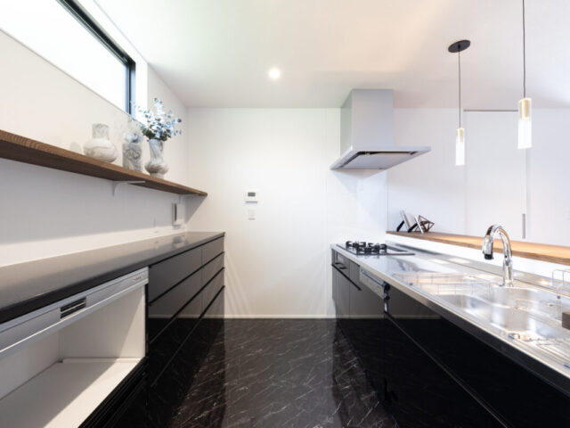 黒を基調とした光沢感のあるキャビネットと石目柄のフロアタイルが印象的なキッチン