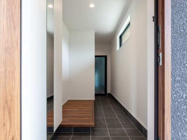 広々とした細長い玄関ホールには、帰宅後すぐに手を洗えるようコンパクトな手洗器を設置