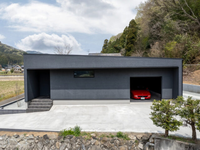 シックなダークグレーの外観に真っ赤な愛車が映える