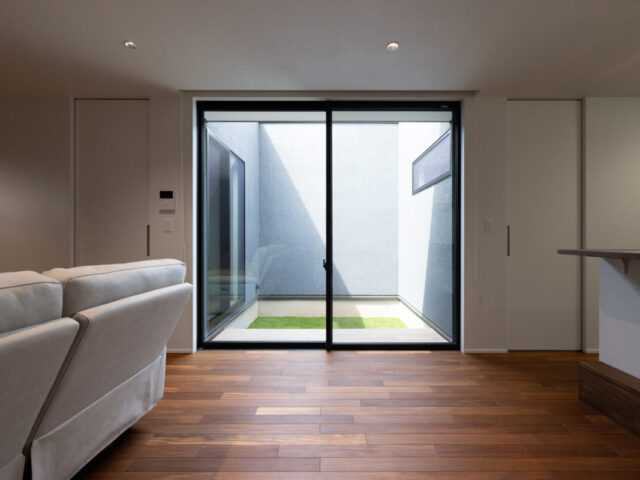 壁に囲まれたプライベートな中庭は、外部からの視線を遮りながらも、青空を感じられる心地よいスペース