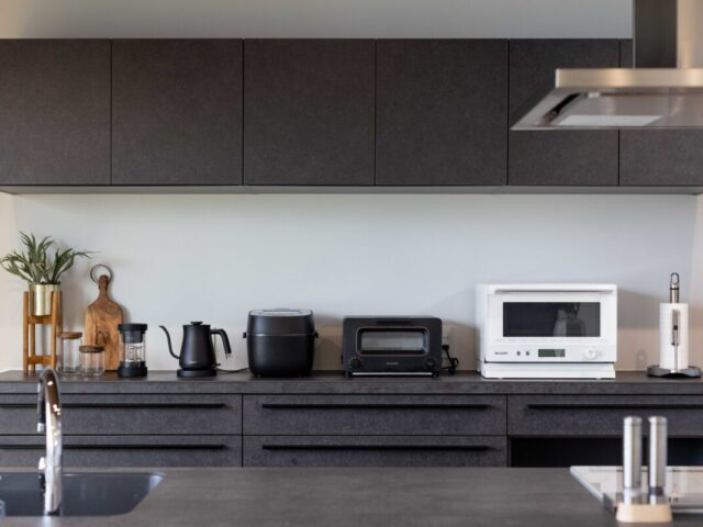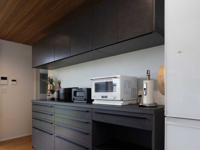 開放感溢れる勾配天井のLDKは、温かみのあるブラックチェリーの床材をベースに、