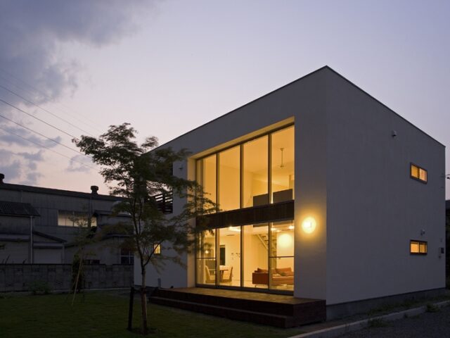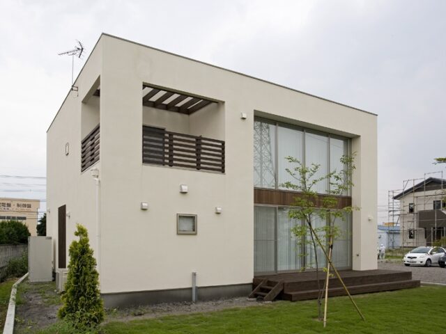 ハコにプラスした「木」のアクセントと、大きな窓がこの家の特徴である。