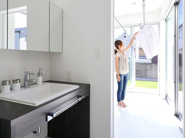 • 洗面・洗濯室に隣接するサンルーム。物干しの他、アイロン掛け用のカウンターも設置。