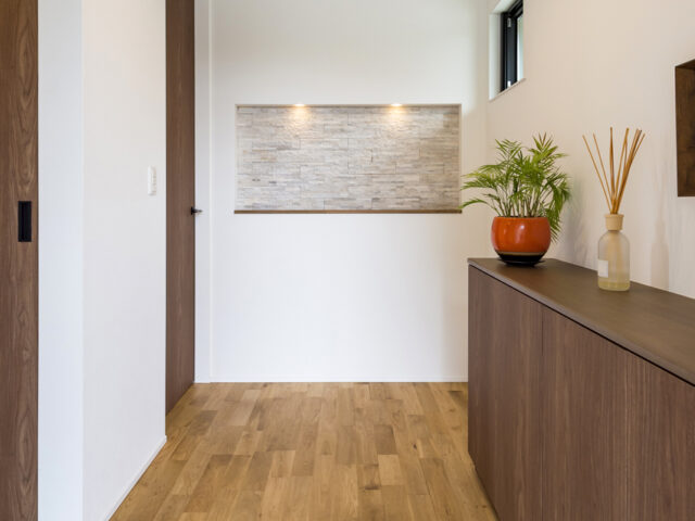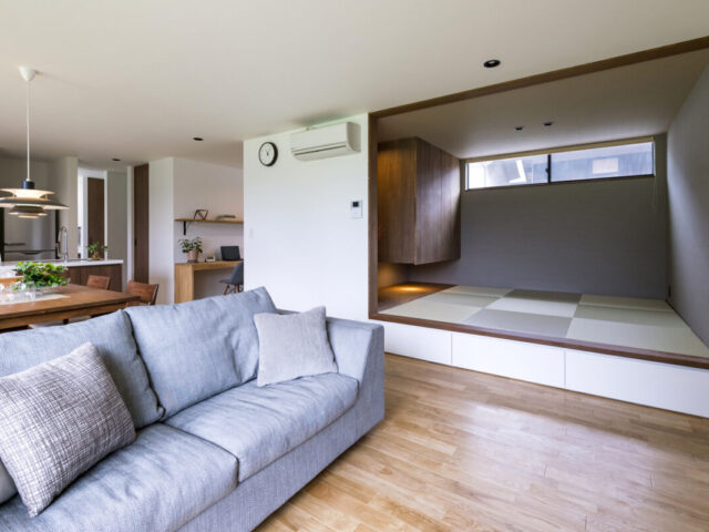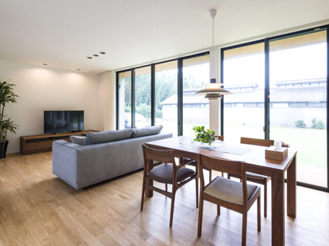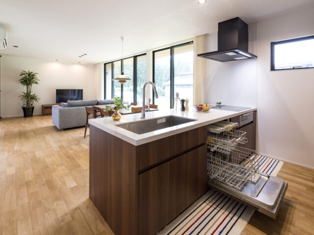 インテリアはオークの床材をメインに落ち着いた色味で統一し、