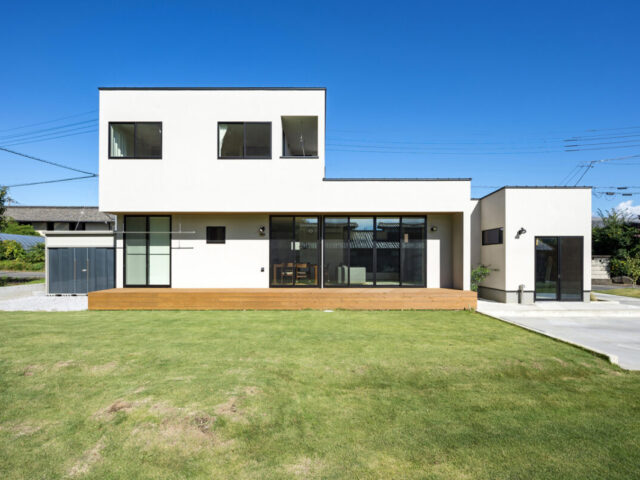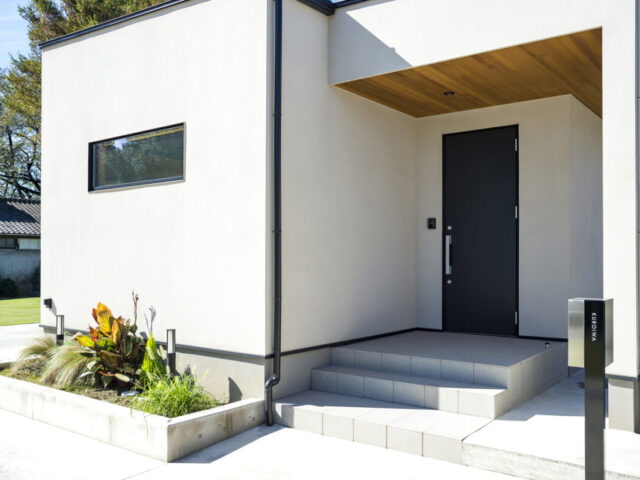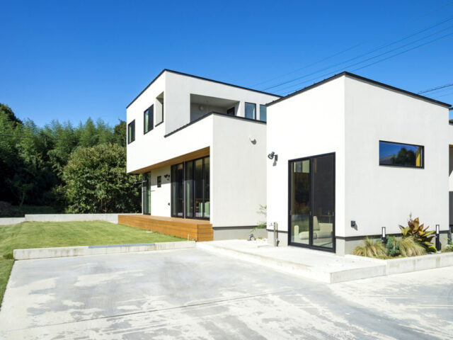 緑豊かな敷地に建つ、シンプルモダンな外観。