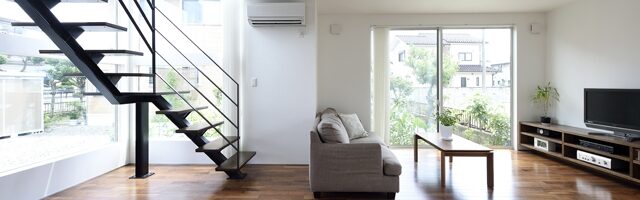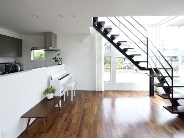 壁の無いひとつながりの大空間で、ブラックの鉄骨階段がオブジェのように際立つ。