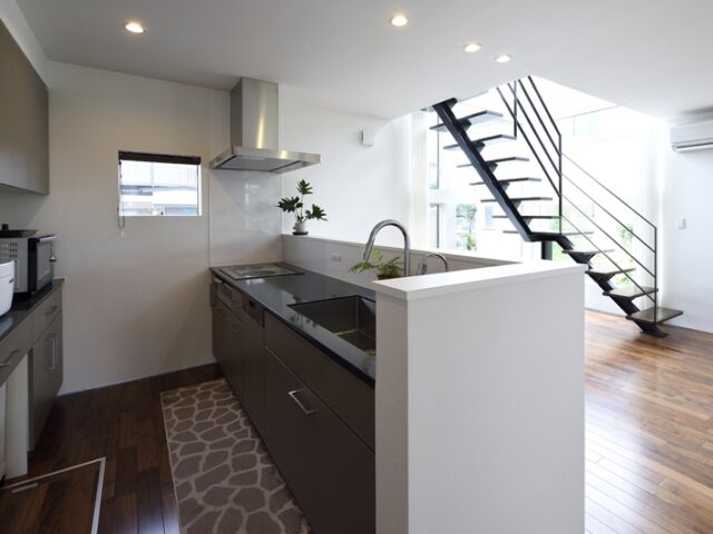 落ち着いたカラーでまとめた、シックなキッチン。壁を設け手元を少し隠すことで、生活感を見せないような工夫をしている。