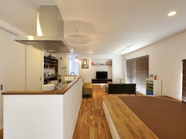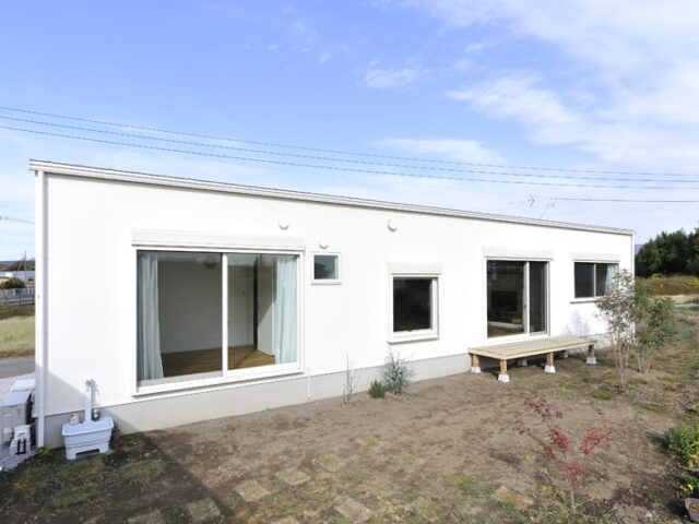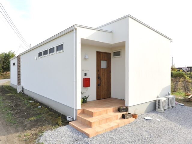 ホワイトカラーにまとめた色彩に加え、シンプルなハコ型を取り入れた平屋デザイン。