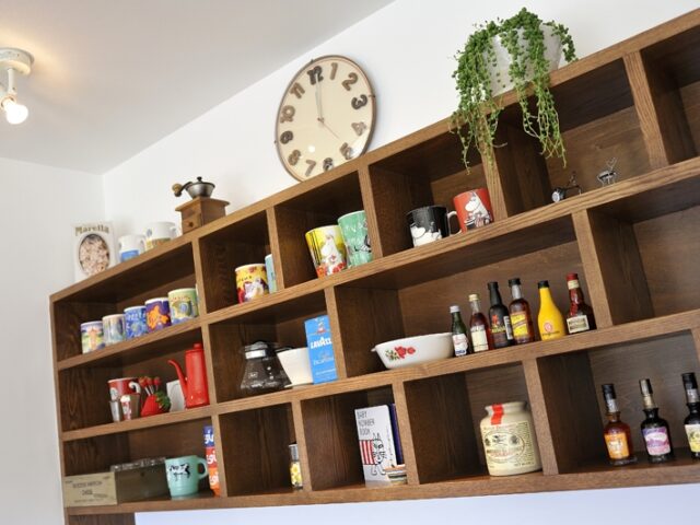 造作棚が目を引くダイニング。全てオープンなので、飾ってある日用品もインテリアの一部としてディスプレイ。