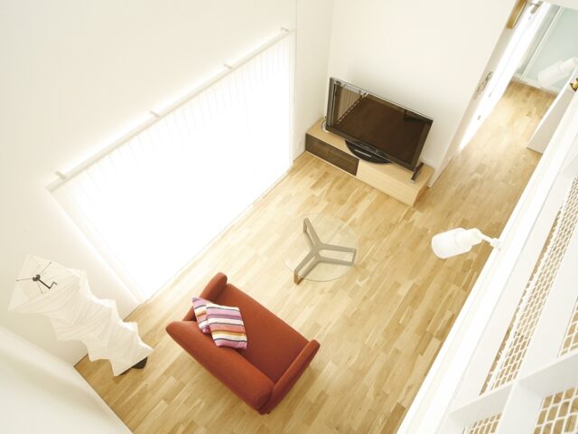 スタイリッシュな外観のモノトーンとは違い、無垢のやさしさに囲まれた明るく穏やかな室内。