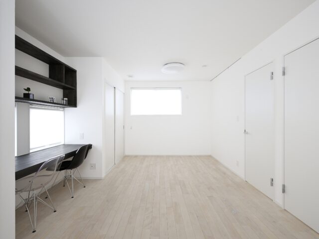 クールな外観の中に、ホワイトに仕上げた無垢の床+モダンな家具が大人の雰囲気を漂わせる。