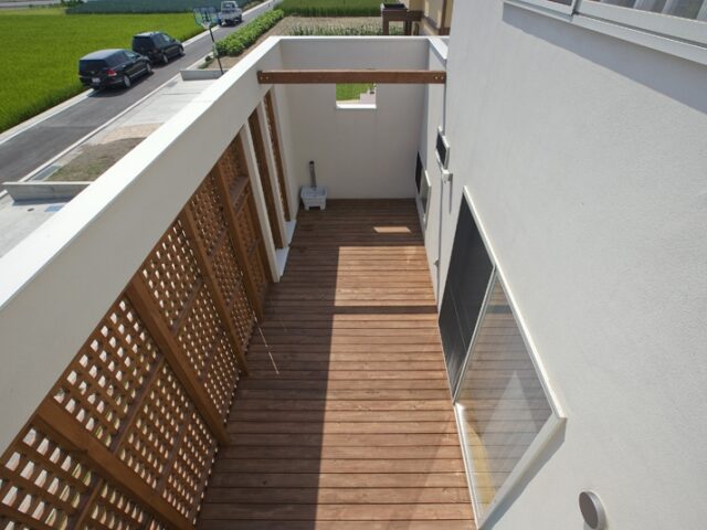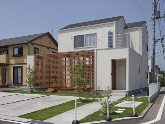 また、ソフトな色合いの外観は、木製の格子がやわらかな雰囲気をつくり、やさしいご家族に心地よい暮らしを与えている。