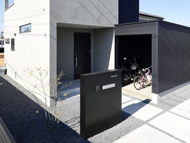 東側アプローチ。外構もトータルコーディネートすることで、統一感のあるシャープな外観が完成する。