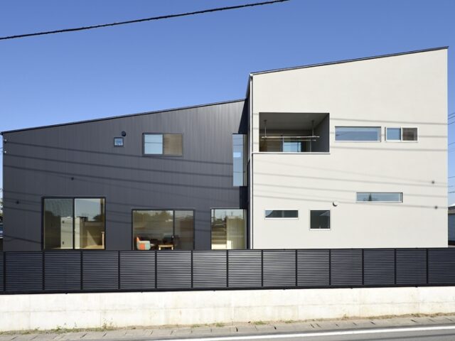 南側から見た外観。二色に分けた外壁が大胆なフォルムを引き立てる。敷地形状を生かした横長のカタチ。
