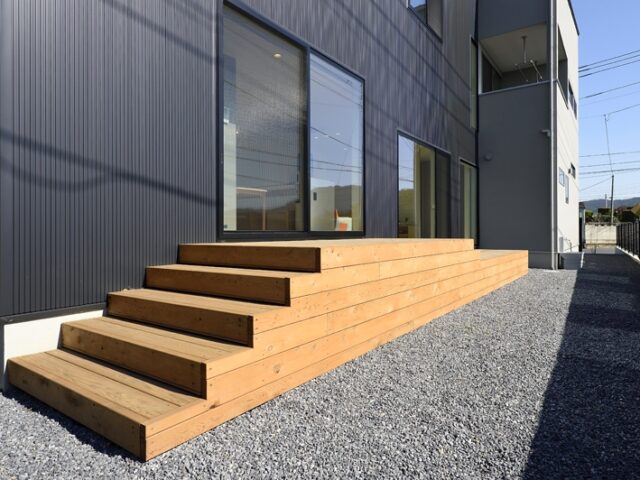 リビングに面したウッドデッキは階段状に設計し、様々なシチュエーションで楽しめるように。