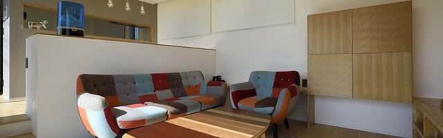 ダイニングキッチンから少し下がった位置にあるリビング。壁付収納がインテリアのアクセントに。