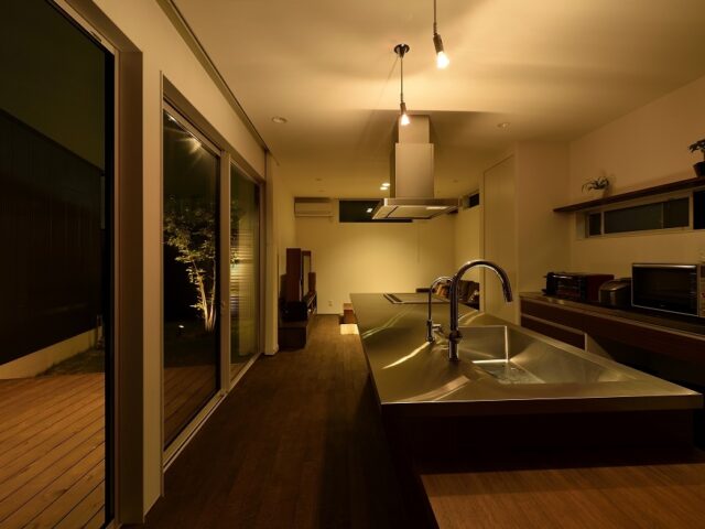 ウォルナットのアイランドキッチンを中心に、シックな色合いで落ち着き感を演出するインテリア。