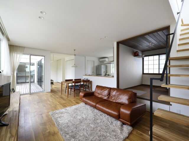 無垢の床材を使用し、温かみのある落ち着いた色味で統一されたインテリア。